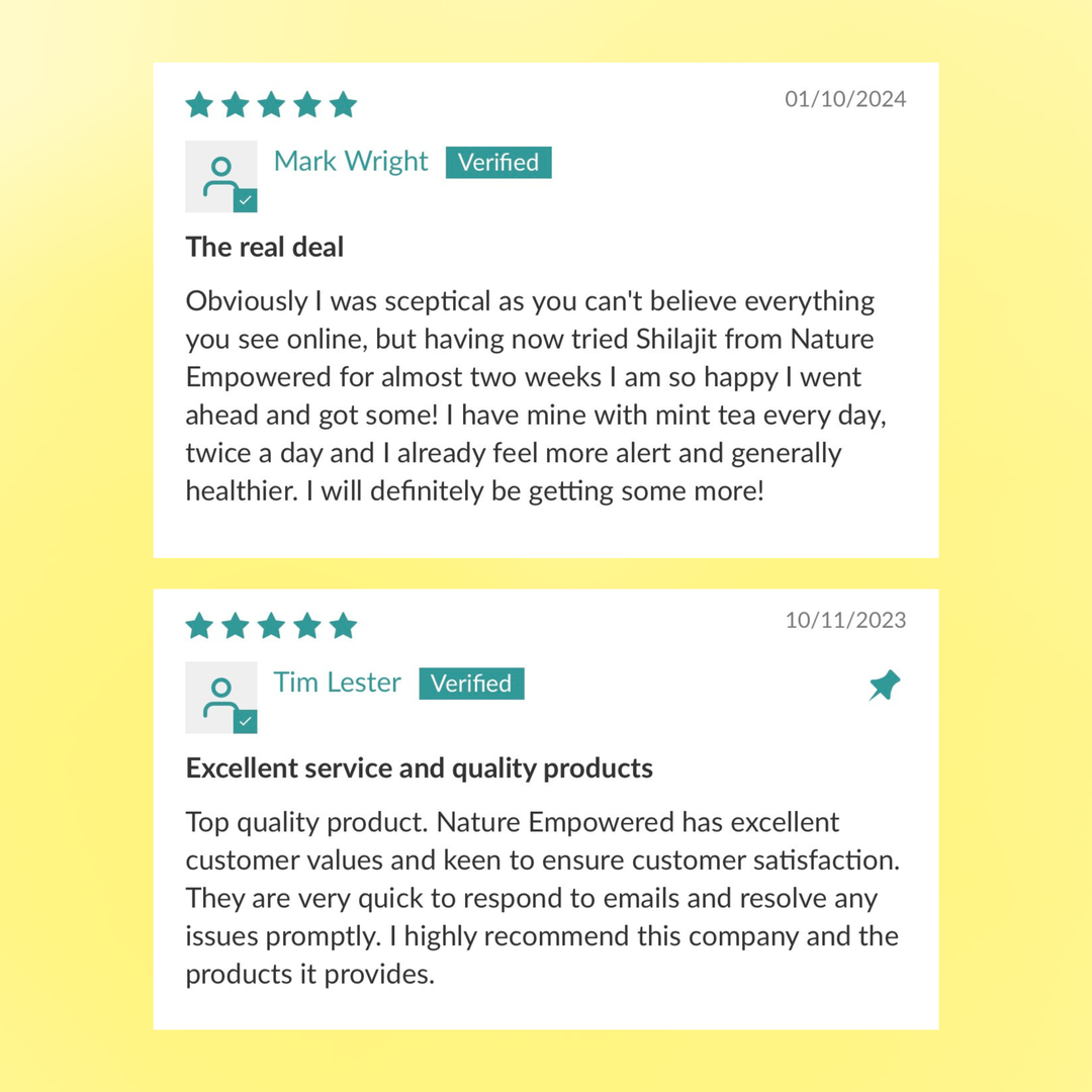 Some context I broke my neck 10 yrs ago needed resuscitation 3 times that night through a 20 hrs op to fix titanium cages to hold c3 to c5 in my neck,I woke paralysed from the neck down to I may get get my arms back but 3 days later I needed a piss and got up and went..to this day surgeons have no idea how...any how from there 2 yrs on high doses of fentanyl, off that to morphine for 4 yrs, then on to strong pain killers ..this is where my shillajit story comes in.I saw shillajit being advertised and like many said yeah right..after a few months I thought f... it and bought one it came was very sweet and didn't do much for me, I did some peer review research about it its taste it's texture and realised I had bought a fake and as I was about to forget it I saw nature Empowered checked out the website and they had a buyone get one free for as long as I'm subscribed..I got it with a free gift turkey tail ..first month on shillajit I started feeling like I was pumped like after a workout..but I was still 9 n half stone I felt so good I got my old weights out and started with small 15 min workouts which is now over a hour plus chair yoga..I'm now over 12 stone no fat this is 100% the shillajit, I've passed it on to many people who are now thanking me for telling them their getting the same benefits, here's a kicker yrs on painkillers and I just stopped, no withdrawal no pain...this is the second time I've wrote this but the other didn't send so I hope this one goes through. Nature Empowered is the real deal as many will see shillajit has exploded everywhere and now companies are say theirs is the only true one blah blah, so as my size and mind get better I said I would do a 5 month review..here it is, I've also had my mind opened to huge benefits from the free mushroom extracts I've gotten..Muhammad answers all emails I send fast if not him a member of his staff..they are open and transparent any issues they come right out and say it, great company, great staff real badass produce..I'm doing this because I'm one of those people who loves to help anyone improve themselves, and this stuff does exactly what it says it can do...they even have their name printed into the tiny spoons, the other company was a lolly stick, so if your on the fence about this shillajit and company I hope I have given someone the thought of f... it I'm gonna try..you won't regret it...great company great customer services and bang on shillajit, and mushrooms...with that said good luck to anyone who tries it you won't regret it...