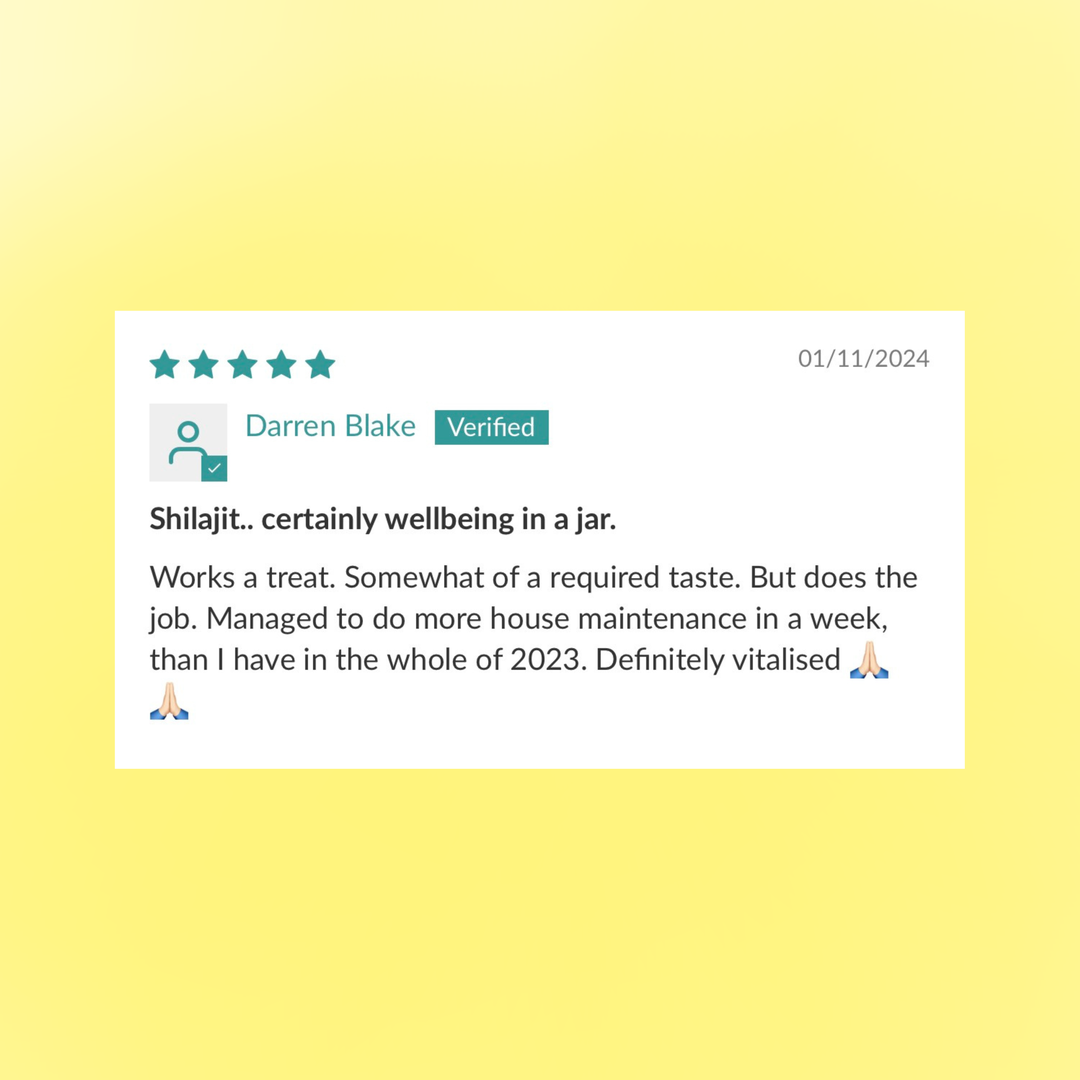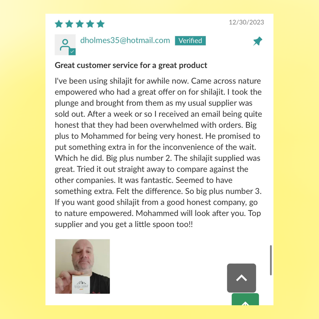 Apologies in advance for the lengthy review but it will all come together in the end π I am an individual that has for the most part, always turned to holistic and natural ways of healing and strengthening the body, and so I am no stranger or novice when dealing with herbs and minerals. I have used various methods when buying medicinal herbs such as on-line or face to face and so have dealt with numerous companies and individuals over the decades (Iβm am 48yrs old). However I have to state at this point βNatural Empoweredβ should be set as a benchmark as to how organisations should operate. I have been very cautious with regards to where I ordered shilajit from. As fantastic as shilajit maybe, if it isnβt carefully sourced and processed you could be ingesting something very heavily contaminated with metals and toxins. From the off set I email the company and an incredible individual by the name of Mohammed responded within hours answering all my queries and concerns regarding the integrity of the product, which I was more than satisfied with, Mohammed assured me they carefully and thoroughly processed their shilajit with certification to support the integrity of their product which was very reassuring and his mannerisms within the email was clearly to assist with care. After using their product for a week, I experienced the incredible benefits almost immediately as indicated in the free book (which was an amazing added bonus). A week later I emailed Mohammed again with another query, (shilajit combination with black seed oil) and true to form he responded immediately (on a Saturday) which was impressive, unexpected and refreshing as most would not have responded until the Monday. I can not praise Natural Empowered or their shilajit product enough from how to deal with customers to the integrity of the product to the clear code of ethics with which they conduct themselves with is to be acknowledged and applauded. This product help my overall well being and I have felt none of the side effects, which I can attribute to the guidance of Mohammed and the purity of their product. To emphasise how impressed I am with them, in a previous life, I was a trading standards officer of 15yrs and so I can state with no uncertainty that this company and product is as good as it gets. I hope this assists other potential customers doing their research ππΌππΌ